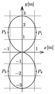 Ez \(\displaystyle \varphi=\pm 54{,}7^\circ\) és \(\displaystyle \varphi=\pm 125{,}3^\circ\)-nál teljesül, és ezeken a helyeken \(\displaystyle r=\tfrac23 \,r_0=2\) m, továbbá \(\displaystyle x=\pm 1{,}15~{\rm m}\), illetve \(\displaystyle y=\pm 1{,}63~{\rm m}\).