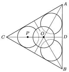 Erről a nézetről leolvashatjuk, hogy a számunkra fontos távolságok (centiméter egységekben számolva) a következők: a háromszög oldalai \(\displaystyle AB=BC=CA=15;\) a háromszög magassága \(\displaystyle CD=AC\cdot \cos 30^\circ=12{,}99\); \(\displaystyle OC=\tfrac23 CD=8{,}66.\) Másrészt \(\displaystyle PC=5\) cm (ez a \(\displaystyle 30^\circ\)-os derékszögű háromszög megfelelő oldalainak arányából kapható meg), így \(\displaystyle OP=OC-PC=3{,}66\).