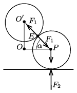 Ezen az ábrán feltüntettük a felső golyó és az egyik alsó golyó között ható, \(\displaystyle F_1\) nagyságú erőket, valamint a talaj által az alsó golyóra kifejtett \(\displaystyle F_2\) erőt is. A korábban kiszámított \(\displaystyle OP=3{,}66\)-ból és az egymást érintő gömbök középpontjának \(\displaystyle OO'=5\) távolságából megkapjuk, hogy az ábrán látható szög: