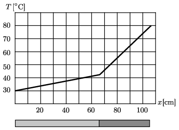 Data: \(\displaystyle \ell_1=65\) cm, \(\displaystyle \ell_2=40\) cm, \(\displaystyle \lambda_1=395~\frac{\rm W}{\rm m\cdot K}\), \(\displaystyle \lambda_2=76~\frac{\rm W}{\rm m\cdot K}\), \(\displaystyle T_1=30\;{}^\circ\)C, \(\displaystyle T_2=80\;{}^\circ\)C.