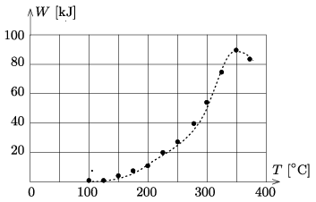 Ebben a képletben \(\displaystyle \varrho_\text{gőz}\), \(\displaystyle \varrho_\text{víz}\) és \(\displaystyle p_\text{gőz}\) a hőmérséklet szerint változó mennyiségek, nagyságukat pl. a Négyjegyű függvénytáblázatokban találhatjuk meg. Feltételezve, hogy \(\displaystyle p_0=101\) kPa, az ábrán vázolt grafikonnak megfelelő \(\displaystyle W(T)\) értékeket kapjuk: