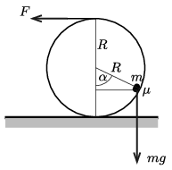P. 5252. \(\displaystyle M\) tömegű, vékony falú csőre fonalat csévélünk, és a fonalat húzva az ábrán látható módon a csövet állandó sebességgel gurítjuk. A cső tisztán gördül a vízszintes talajon. A cső belsejébe kis méretű, \(\displaystyle m\) tömegű testet helyeztünk, ami odabent állandósult szöghelyzetben csúszik, a súrlódási együttható itt \(\displaystyle \mu\). Mekkora vízszintes fonálerő szükséges az állandó sebesség fenntartásához?