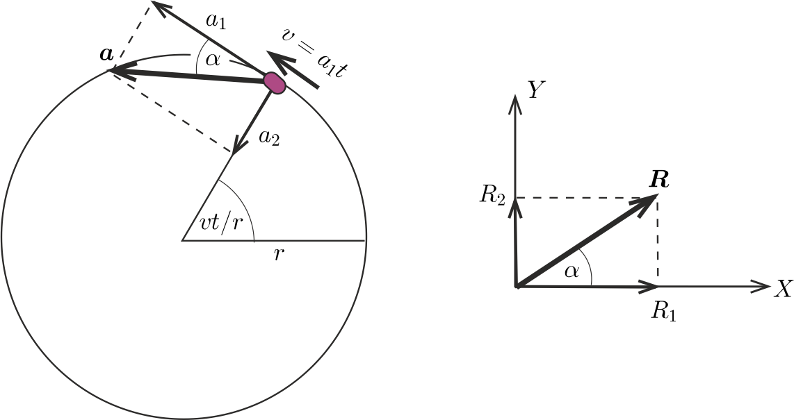 Az \(\displaystyle \boldsymbol R\) vektor nagyságát jelölje \(\displaystyle R\), az autó haladási irányával (vagyis az \(\displaystyle X\) tengellyel) bezárt szöge pedig legyen \(\displaystyle \alpha\). Ennek megfelelően