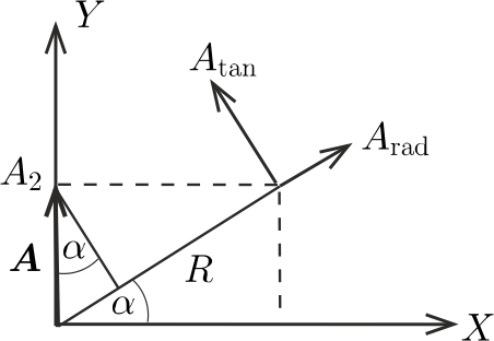 Itt azonban figyelembe kell vegyük, hogy a radiális és a tangenciális komponensek, valamint az \(\displaystyle (A_1,A_2)\) komponensek közötti kapcsolat a forgásból származó extra tagokat is tartalmaz: