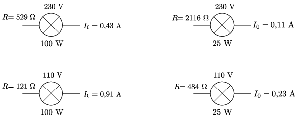 \(\displaystyle d)\) egy 230 V, 25 W-os izzót és egy 110 V, 100 W-os izzót?