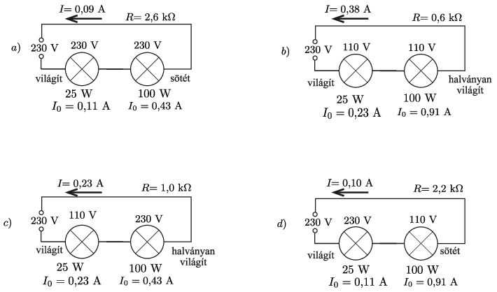 \(\displaystyle c)\) egy 110 V, 25 W-os izzót és egy 230 V, 100 W-os izzót;