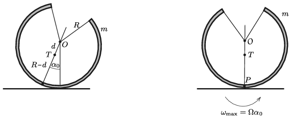 P. 5286. Egy \(\displaystyle R\) sugarú, homogén tömegeloszlású, \(\displaystyle \varphi\) szöggel ,,hiányos'' vékony hengerpalástot vízszintes asztalra fektetünk az ábrán látható módon. A hengerpalástot kissé kimozdítjuk egyensúlyi helyzetéből, majd elengedjük. Határozzuk meg a hengerpalást rezgőmozgásának periódusidejét! Feltételezhetjük, hogy súrlódás elegendően nagy, így a hengerpalást a rezgőmozgás közben nem csúszik meg.