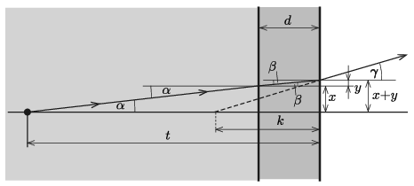 P. 5288. Egy akvárium fala \(\displaystyle d=12\) mm vastagságú, \(\displaystyle n_\text{ü}= {3}/{2}\) törésmutatójú üvegből készült. Az akváriumban \(\displaystyle n_\text{v}= 4/3\) törésmutatójú vízben úszkál egy halacska. Kívülről, az akvárium falára merőleges irányból nézve a fal külső felületétől mekkora távolságra lévőnek tűnik a halacskának az a pontja, amely valójában pontosan \(\displaystyle t=20\) cm távolságra van a fal külső felületétől?
