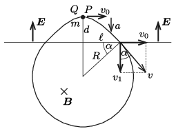 \(\displaystyle B=\frac{mv}{QR}=\frac{mv_1}{\ell Q}= \frac{m}{Q}\frac{\sqrt{\displaystyle\frac{2dEQ}{m}}}{\sqrt{\displaystyle\frac{2dmv_0^2}{EQ}}}=\frac{E}{v_0}.\)