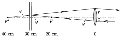 A síktükör által visszavert sugarak egy részét a lencse ismét fókuszálja, tehát a ,,második fókuszpontba'' helyezett tégelyben is gyorsabban fog megolvadni a jég , mint a környező helyeken. Az \(\displaystyle F\) fókuszponton áthaladó sugarak a tükröződés után úgy haladnak tovább, mintha az \(\displaystyle F'\) pontből indultak volna el. Ez a pont éppen a lencse kétszeres fókusztávolságánál van, tehát a megfelelő képtávolság is ugyanekkora lesz. A tégelyt tehát a lencse elé, attól 40 cm-távolságra elhelyezve viszonylag gyors jégolvadást várhatunk. Az ábráról leolvasható, hogy a tükröződő képalkotásban csak azok a fénysugarak vesznek rész, amelyek az optikai tengelytől mérve \(\displaystyle x=2{,}5\) cm-nél kisebb távolságban érték el a lencsét. Ez a távolság a lencse sugarának felét, felületének \(\displaystyle \tfrac14\) részét jelenti, tehát a második helyzetben négyszer hosszabb idő, kb. 18 s alatt olvad meg a jég.