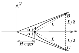 \(\displaystyle B: \qquad \left( \ctg\alpha\sqrt{\left(\frac{L}{2}\right)^2+H^2}, \frac{L }{2}\right),\)