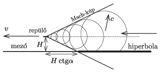 A Mach-kúp felületének pontjaiba egyszerre érkezik meg a repülőgép hangja. A Mach-kúp és a vízszintes, sík mező közös pontjai egy olyan hiperbolán helyezkednek el, amelynek aszimptotái \(\displaystyle 2\alpha\) szöget zárnak be egymással, és a hiperbola két ágának távolsága \(\displaystyle 2H\,\ctg\alpha\) (1. ábra).
