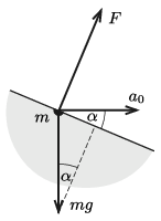 \(\displaystyle mg\sin\alpha=ma_0\cos\alpha,\qquad \text{tehát}\qquad \tg\alpha=\frac{a_0}{g}.\)