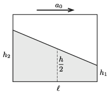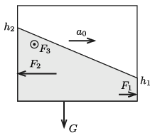 P. 5341. Tehervonat szállít egy \(\displaystyle \ell\) hosszú, \(\displaystyle d\) széles és \(\displaystyle h\) magas téglatest alakú konténert, amely félig van töltve \(\displaystyle \varrho\) sűrűségű folyadékkal. Mekkora erővel nyomná a folyadék a konténer alaplapját és oldallapjait, ha a vonat képes lenne vízszintes pályán hosszú ideig állandó \(\displaystyle a_0\) gyorsulással haladni? (A konténer leghosszabb éle párhuzamos a sínekkel, és a folyadék még akkor sem folyna ki a tartályból, ha az felül nyitott lenne.)