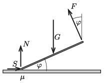 Megoldás: Jelöljük a rúd súlyát \(\displaystyle G\)-vel, hosszát \(\displaystyle \ell\)-lel, a felső végénél ható erőt \(\displaystyle F\)-fel, az alsó végénél ható nyomóerőt \(\displaystyle N\)-nel, és végül a súrlódási erőt \(\displaystyle S\)-sel (lásd az ábrát).