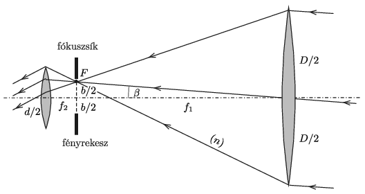 Megjegyzés. A feladatban \(\displaystyle D/N<d\) (tehát a fenti \(\displaystyle b\) és \(\displaystyle \beta\) pozitív), de elvben elképzelhető, hogy \(\displaystyle D/N>d\). Ekkor egy az objektíven áthaladó, eredetileg párhuzamos sugárnyaláb szélessége az okulár síkjában már nagyobb lesz, mint a szemlencse átmérője. Ebben az esetben a fényerő szerinti torzításmentesség feltétele az, hogy a szemlencse teljes terjedelmében essen bele az objektíven átjövő sugárnyalábba. A fentihez hasonló számolás alapján ez akkor teljesül a blende által megengedett minden irányra, ha