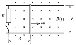 Megoldás. Az adott elrendezésben egyszerre lép fel a nyugalmi és a mozgási indukció jelensége. A fémpálca a \(\displaystyle t\) időpillanatban \(\displaystyle d+v_0t\) távol van a kapcsolótól és az ellenállástól, tehát a pálca által képezett zárt hurok területe \(\displaystyle A(t)=(d+v_0t)\ell,\) aminek változási sebessége: