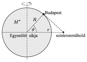 Legyen a Föld megváltozott tömege \(\displaystyle M^*\), de a forgási ideje a jelenlegi \(\displaystyle T=86\,400~\rm s\). (A műsorszóró műholdak ún. szinkronpályán, az Egyenlítő síkjában és a Földdel megegyező szögsebességgel mozognak. Csak így teljesülhet, hogy a földi antennák mindig ugyanott ,,látják'' a műholdat az égen.)