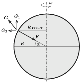 \(\displaystyle F\cos\alpha-G_2=m(R\cos\alpha)\,\omega^2,\)