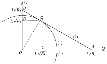 Az (1) összefüggés az \(\displaystyle (x_1,x_2)\) koordináta-rendszerben egy \(\displaystyle \sqrt P\) sugarú kör egyenlete, (2) pedig egy olyan egyenest határoz meg, aminek tengelymetszetei \(\displaystyle I\sqrt{R_1}\) és \(\displaystyle I\sqrt{R_2}\) (lásd az ábrát).