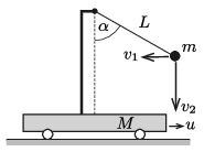 P. 5408. A simple pendulum is attached to the top of a rod mounted to a trolley of mass \(\displaystyle M=3m\). The trolley is on a horizontal surface. The length of the thread of the pendulum is \(\displaystyle L=50\) cm, and the mass of the point-like bob at its end is \(\displaystyle m=0.15\) kg. Initially the objects are at rest. Then the pendulum bob is displaced such that its thread is tight and horizontal, and then released without initial speed. Friction is negligible everywhere.