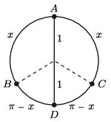 Ha a \(\displaystyle B\) és a \(\displaystyle C\) pont között mérünk ellenállást, a szimmetria miatt az \(\displaystyle A\) és a \(\displaystyle D\) pontok ekvipotenciálisak lesznek, és emiatt a közöttük lévő egyenes drótdarabot kiiktathatjuk. A mért ellenállás egy \(\displaystyle 2x\) nagyságú és egy \(\displaystyle 2(\pi-x)\) nagyságú, párhuzamosan kapcsolt ellenállás eredője lesz:
