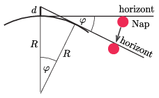 Megoldás. Amikor hirtelen felállunk, a szemünk kb. \(\displaystyle d=\)1,5 méterrel magasabbra kerül (ez egy becslés csupán), így a horizontunk a korábbi helyzetéhez képest valamekkora \(\displaystyle \varphi\) szöggel elfordul. A (nem méretarányos!) ábráról leolvasható, hogy