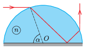 P. 5487. Egy \(\displaystyle n\) törésmutatójú félhenger síklapját befoncsorozzuk. Az ábrának megfelelően a félhengert egy lézersugárral vízszintesen megvilágítjuk. Mekkora \(\displaystyle \alpha\) értéknél lesz a kilépő fénysugár éppen függőleges? Mennyi legyen \(\displaystyle n\) minimális értéke, hogy ilyen sugármenet lehetséges legyen?