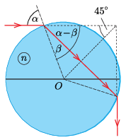 Megoldás. Tükrözzük a félgömböt és a fénysugár útvonalát a foncsorozott felületre. Így egy teljes hengeren áthaladó, kétszer megtörő fénysugarat kapunk, amely a beesés irányához képest összesen \(\displaystyle 90^\circ\)-os szögben térül el.