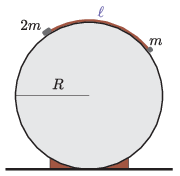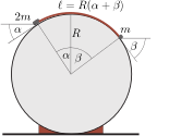 A fonál egyik végéhez \(\displaystyle m\), a másikhoz \(\displaystyle 2m\) tömegű, pontszerűnek tekinthető testet erősítettünk. Legfeljebb mekkora \(\displaystyle \ell\) esetén lehet egyensúlyban ez a rendszer?