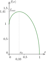 1. módszer. Valamilyen rajzolóprogram segítségével ábrázoljuk \(\displaystyle f(x)\)-et. A grafikonról (1. ábra) leolvashatjuk, hogy a függvény a maximumát \(\displaystyle x\approx 0{,}33\approx \tfrac13\) értéknél veszi fel.