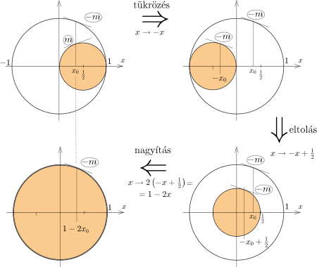 6. módszer. Induljunk ki most is az \(\displaystyle f(x)\) függvény két tagjának megfelelő körökből. Olyan \(\displaystyle x_0\) abszcisszájú pontokat keresünk, amelyhez tartozó érintők meredekségének nagysága megegyezik, csak az előjelük különböző. A 3. ábra vázlatosan mutatja, hogy három egyszerű geometriai transzformációval a (színesen jelölt) kis kört átvihetjük (áttranszformálhatjuk) a nagyobb körbe.