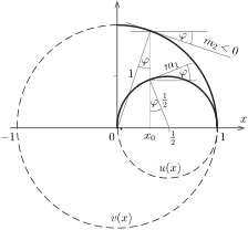 \(\displaystyle f(x)=u(x)+v(x)\) maximumát keressük. Legyen \(\displaystyle u(x)\) meredeksége (az érintőjének iránytangense az \(\displaystyle x\) absszciszájú helyen \(\displaystyle m_1(x)\), \(\displaystyle v(x)\) meredeksége pedig \(\displaystyle m_2(x)<0\). Keressük meg azt az \(\displaystyle x_0\) értéket, amelynél