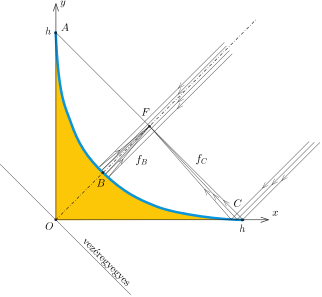 A tükör \(\displaystyle C\) pontjához érkező, a parabola tengelyével párhuzamos, tehát \(\displaystyle 45^\circ\)-os beesési szögű fénysugár \(\displaystyle 45^\circ\)-os szögben verődik vissza, az \(\displaystyle A\) pont irányába halad. Az optikai tengelyt a \(\displaystyle (h/2, h/2)\) koordinátájú \(\displaystyle F\) pontban éri el, ez a pont tehát a tükör fókuszpontja. A \(\displaystyle BF=f_B\) távolság \(\displaystyle h/2\sqrt{2}\), és – a gömbtükör ismert tulajdonságai miatt – ennek kétszerese a parabola görbületi sugara a \(\displaystyle B\) pontban: