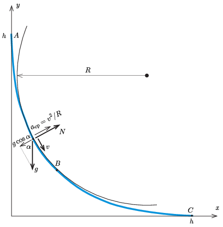 \(\displaystyle c)\) Végül a pálya legalsó, \(\displaystyle C\) pontjánál \(\displaystyle \alpha=0^\circ\), \(\displaystyle v_C=\sqrt{2gh}\) és \(\displaystyle R_C=2h\), így \(\displaystyle N_C=2mg\).