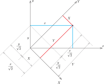 Az \(\displaystyle (x,y)\) és a hozzá képest \(\displaystyle 45^\circ\)-kal elforgatott \(\displaystyle (X,Y)\) koordináta-rendszerek kapcsolata az 1. ábráról olvasható le: