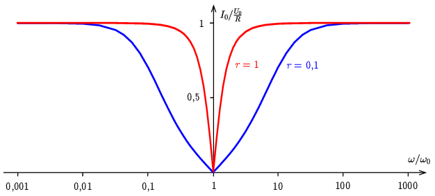 dimenziótlan paraméter jellemzi. (Érdekes módon ebben a rezgőkörben akkor van éles rezonancia, ha \(\displaystyle R\) nagy.) A grafikonon az \(\displaystyle r=0{,}1\) (kék) és az \(\displaystyle r=1\) (piros) esetet ábrázoltuk.