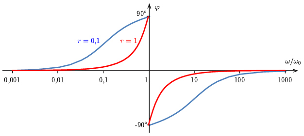 Végül a 4. ábra az áramkör fázisát mutatja, szintén az \(\displaystyle \omega\) körfrekvencia függvényében, két különböző \(\displaystyle r\) érték esetében.