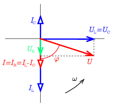 A főágban és az ellenálláson ennek a két vektornak az eredője fog folyni (\(\displaystyle I_0\), függőleges piros vektor az ábrán, nagysága a két áram nagyságának különbsége), az ellenállás \(\displaystyle U_{\mathrm{R}}=RI_{\mathrm{R}}=RI_0\) feszültsége (zöld vektor) pedig ezzel azonos fázisú, azonos irányba mutat.