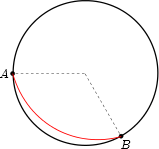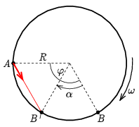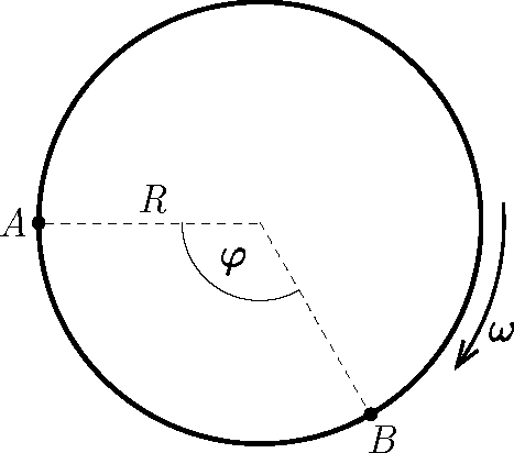 P. 5546. Az Eszkimók Csodák Palotájában található egy függőleges tengely körül \(\displaystyle \omega=\pi/6~\text{s}^{-1}\) szögsebességgel forgó, \(\displaystyle R=3~\text{m}\) sugarú, kör alakú jégpályára épített iglu. A forgó igluban két gyerek ül az ábrán látható helyzetben, egymáshoz képest \(\displaystyle \varphi=120^\circ\)-os szögben. Az \(\displaystyle A\) pontban ülőnek sikerül úgy elindítania egy kis méretű korongot, hogy az pont a \(\displaystyle B\) helyen ülő társa kezébe érkezzen az indítást követően \(\displaystyle t=2~\text{s}\) múlva.