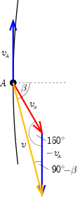 \(\displaystyle \frac{\sin(90^\circ-\beta)}{\sin150^\circ}=\frac{v_\mathrm{ir}}{v}\qquad\rightarrow\qquad\beta=75{,}4^\circ.\)