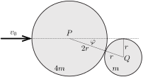 Jelöljük a nagyobb korong ütközés előtti sebességvektorát \(\displaystyle \boldsymbol{v}_0\)-lal. Ha a kis korong tömege \(\displaystyle m\), akkor a megadott feltételek miatt a nagyobb korong tömege nyilván \(\displaystyle 4m\) lesz. Az ütközés pillanatában (lásd az 1. ábrát) a korongok \(\displaystyle P\) és \(\displaystyle Q\) középpontjára illeszkedő egyenesnek a nagyobb korong kezdeti mozgásirányával bezárt szöge: