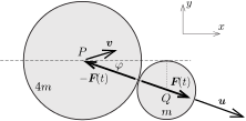 Az ütközés során a két korong között egy nagyon rövid ideig tartó, nagyon nagy \(\displaystyle \boldsymbol{F}(t)\) erő lép fel, ami a kezdetben álló kis korongot \(\displaystyle P\rightarrow Q\) irányba valamekkora \(\displaystyle \boldsymbol{u}\) sebességgel meglöki. Eközben a nagy korong sebessége \(\displaystyle \boldsymbol{v}\)-re változik (2. ábra). A kis korong az ütközés előtt állt, így \(\displaystyle \boldsymbol{u}\) iránya nyilván megegyezik \(\displaystyle \boldsymbol{F}\) irányával.