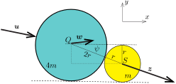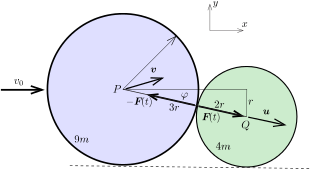 Az ütközés során a két korong között egy nagyon rövid ideig tartó, nagyon nagy \(\displaystyle \boldsymbol{F}(t)\) erő lép fel, ami a kezdetben álló kisebb korongot \(\displaystyle \overrightarrow{PQ}\) irányba valamekkora \(\displaystyle \boldsymbol{u}\) sebességgel meglöki. Eközben a nagyobb korong sebessége \(\displaystyle \boldsymbol{v}\)-re változik. A kisebb korong az ütközés előtt állt, így \(\displaystyle \boldsymbol{u}\) iránya nyilván megegyezik \(\displaystyle \boldsymbol{F}\) irányával.