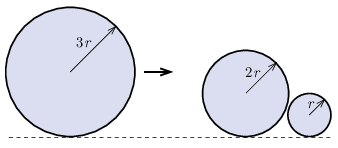 A rugalmasnak tekinthető ütközés után a \(\displaystyle 3r\) sugarú korong a súrlódás miatt lelassul és \(\displaystyle d=5~\mathrm{cm}\) út megtétele után megáll. Milyen irányban és milyen messzire jutnak el a kisebb korongok az asztalon? A korongok közötti súrlódás elhanyagolható.