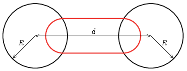 P. 5568. Egymástól \(\displaystyle d\) távolságra lévő \(\displaystyle R\) sugarú (\(\displaystyle d>2R\)) kör alakú tartományban (két fekete kör) a homogén térben a mágneses indukció nagysága \(\displaystyle B\), és az ábra síkjára merőlegesen, azonos irányba mutat. A \(\displaystyle Q\) töltésű, \(\displaystyle m\) tömegű, pontszerű részecske \(\displaystyle v\) sebességgel az ábrán látható periodikus pályán mozog (piros görbe). Mennyi idő alatt tesz meg egy periódust a részecske? Mekkora lehet a mágneses indukció legkisebb értéke, hogy még kialakuljon periodikus pálya?