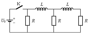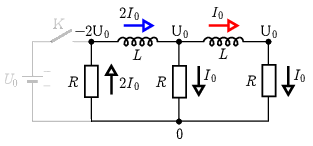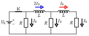 \(\displaystyle b)\) Az ellenállásokon \(\displaystyle U_R=RI_R\) feszültség esik, így a tekercsek végpontjainak feszültsége az ellenállások közös csomópontjához viszonyítva \(\displaystyle -2U_0\), \(\displaystyle U_0\) és \(\displaystyle U_0\) (2. ábra). Ez alapján a tekercseken indukálódott feszültség közvetlenül a kapcsoló kikapcsolása után: