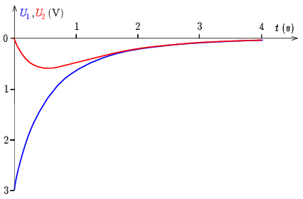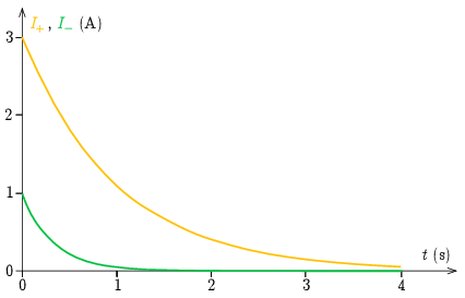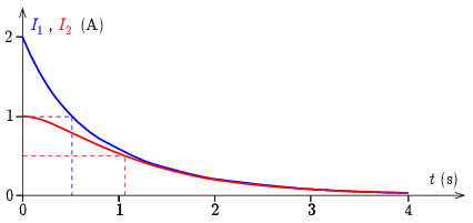 $$\begin{align*} I_{+}(t)=I_1(t)+I_2(t)&=3I_0\,\mathrm{e}^{-t/\tau_1}=3\,\mathrm{A}\cdot\mathrm{e}^{-t/1\,\mathrm{s}},\\ I_{-}(t)=I_1(t)-I_2(t)&=I_0\,\mathrm{e}^{-t/\tau_2}=1\,\mathrm{A}\cdot\mathrm{e}^{-3t/1\,\mathrm{s}}. \end{align*}$$\(\displaystyle d)\) Azt keressük, hogy az egyes tekercseken mekkora \(\displaystyle t_1\), illetve \(\displaystyle t_2\) idő alatt csökken az áramerősség a kapcsoló nyitása után közvetlen mért érték felére. \(\displaystyle I_1(t_1)\)-t és \(\displaystyle I_2(t_2)\)-t írjuk fel az előző rész megoldása alapján, majd tegyük egyenlővé a kezdeti értékek felével: