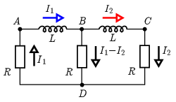 \(\displaystyle L\frac{\mathrm{d}I_1}{\mathrm{d}t}+R(I_1-I_2)-RI_2-L\frac{\mathrm{d}I_2}{\mathrm{d}t}+R(I_1-I_2)+RI_1=0,\)