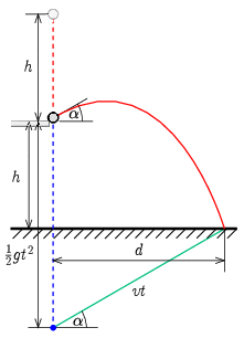 I. megoldás. A mozgás első szakaszában a golyó szabadeséssel megtesz \(\displaystyle h\) utat, majd \(\displaystyle v=\sqrt{2gh}\) sebességgel az asztal sarkához érkezik. Innen ugyanakkora sebességgel ismeretlen szögben elpattan (ferde hajítás), és szintén \(\displaystyle h\) távolsággal mélyebben talajt ér. A ferde hajítások következő tulajdonságát fogjuk kihasználni: a \(\displaystyle v\) sebességgel elhajított test \(\displaystyle t\) idő múlva \(\displaystyle vt\) távolságra lesz az ugyanakkor, ugyanonnan álló helyzetből induló, szabadeséssel gyorsuló képzeletbeli ponttól. Ez a pont \(\displaystyle t\) időpontban a talajtól \(\displaystyle h-\tfrac{1}{2}gt^2\) magasságban lesz. A két távolságból Pitagorasz tétellel kapjuk meg a hajítás \(\displaystyle d\) vízszintes távolságát a \(\displaystyle t\) ideig repülő golyóra: